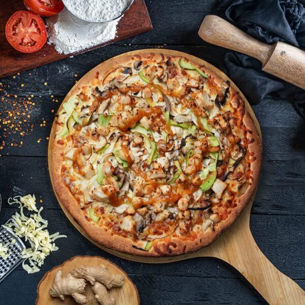 Satay Sauce, Chicken, Capsicum, Mushrooms, Onion and Cheese.
