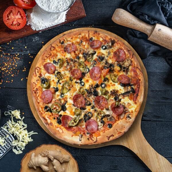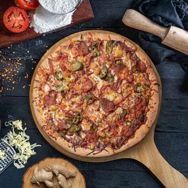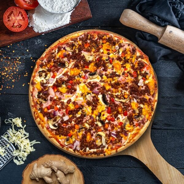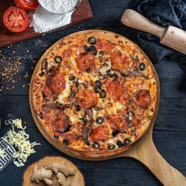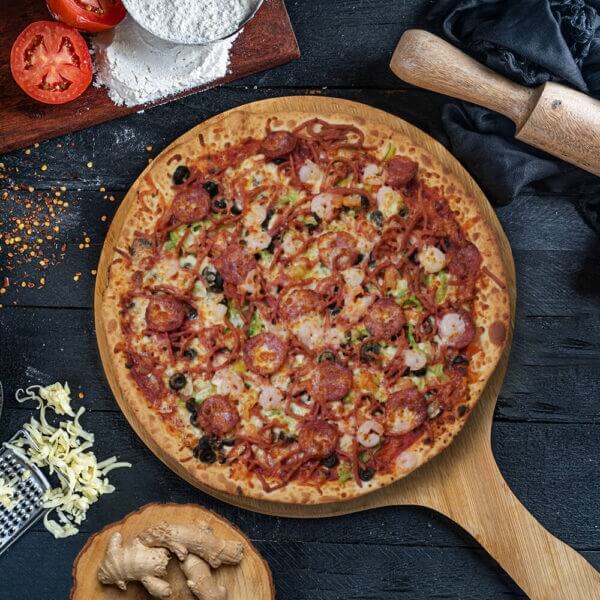 Tomato Sauce, Ham, Pepperoni, Capsicum, Fresh Tomato, Mushrooms, Olives, Cheese and Prawns.