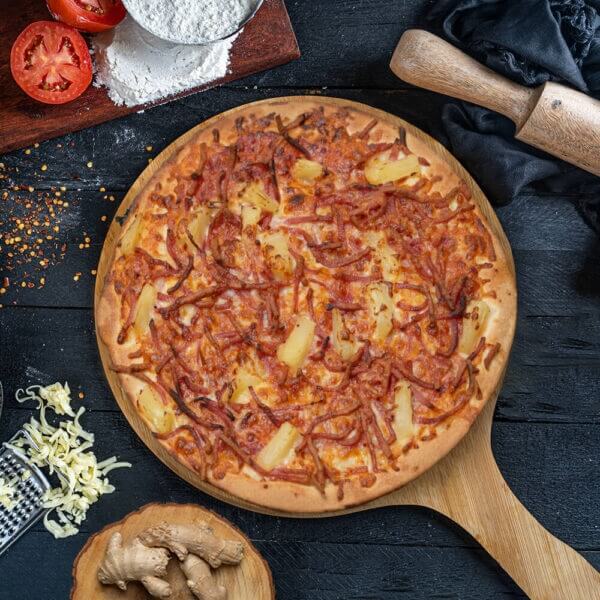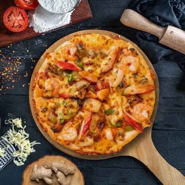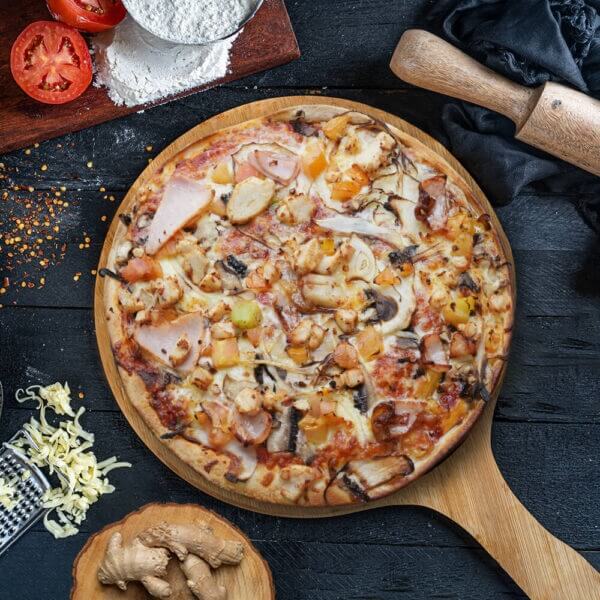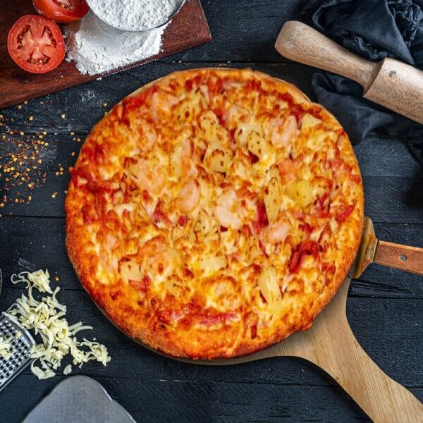 Tomato Sauce, Chicken, Ham, Fresh Tomato, Pineapple, Cheese and Prawns.