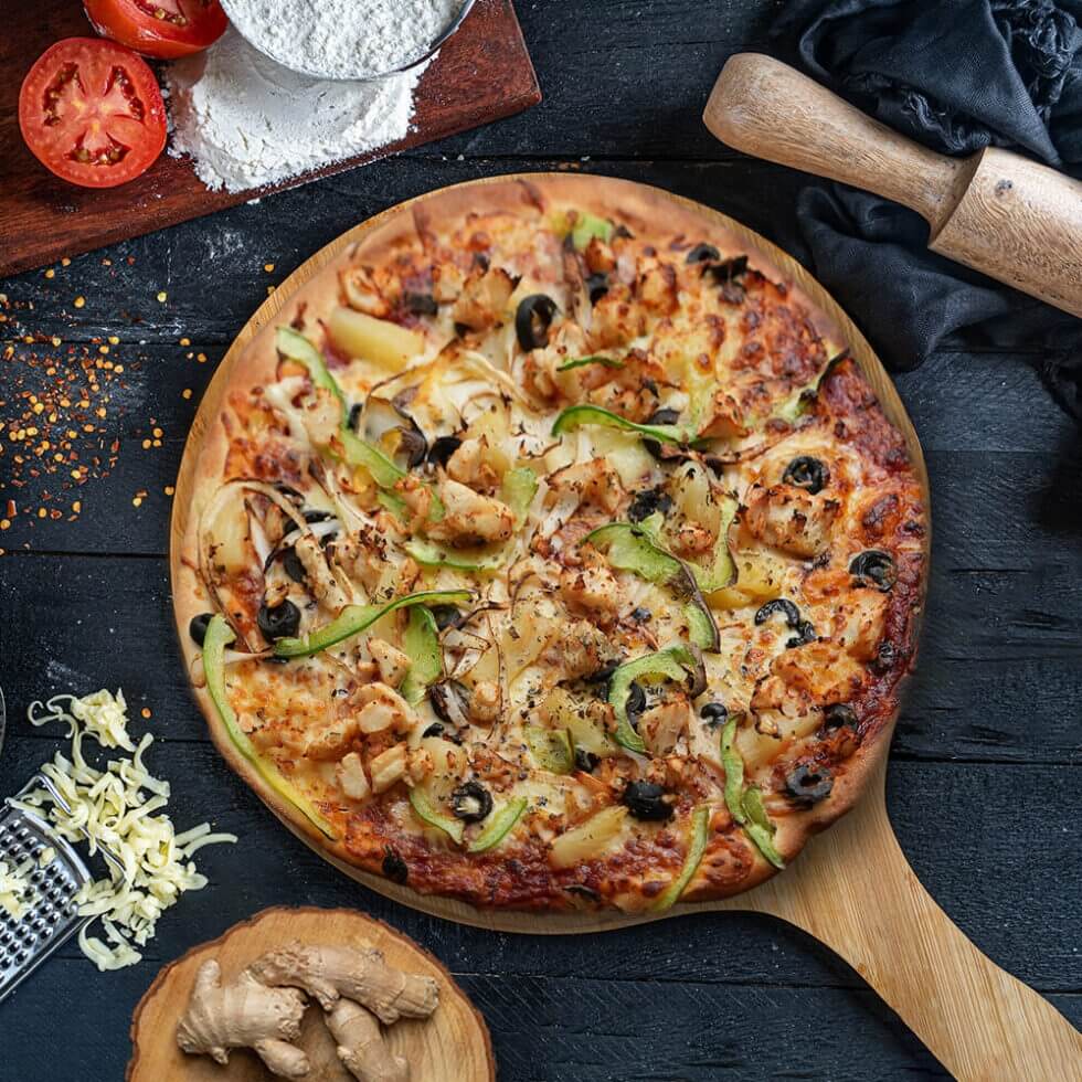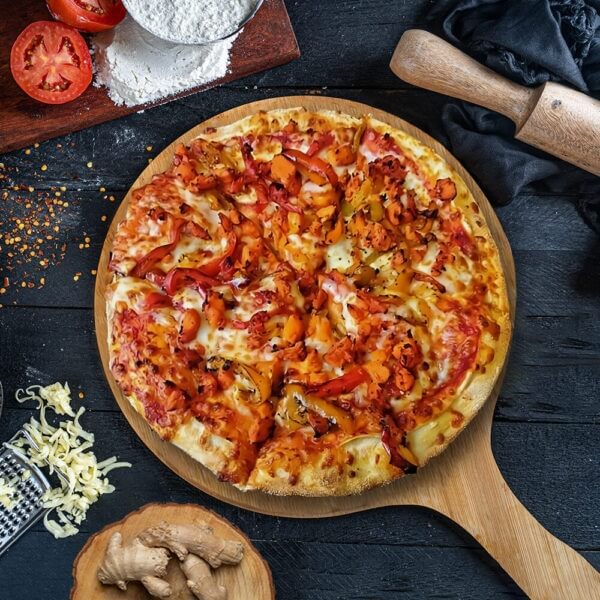 Tomato Sauce, Chicken, Capsicum, Fresh Tomato, Onion and Cheese.