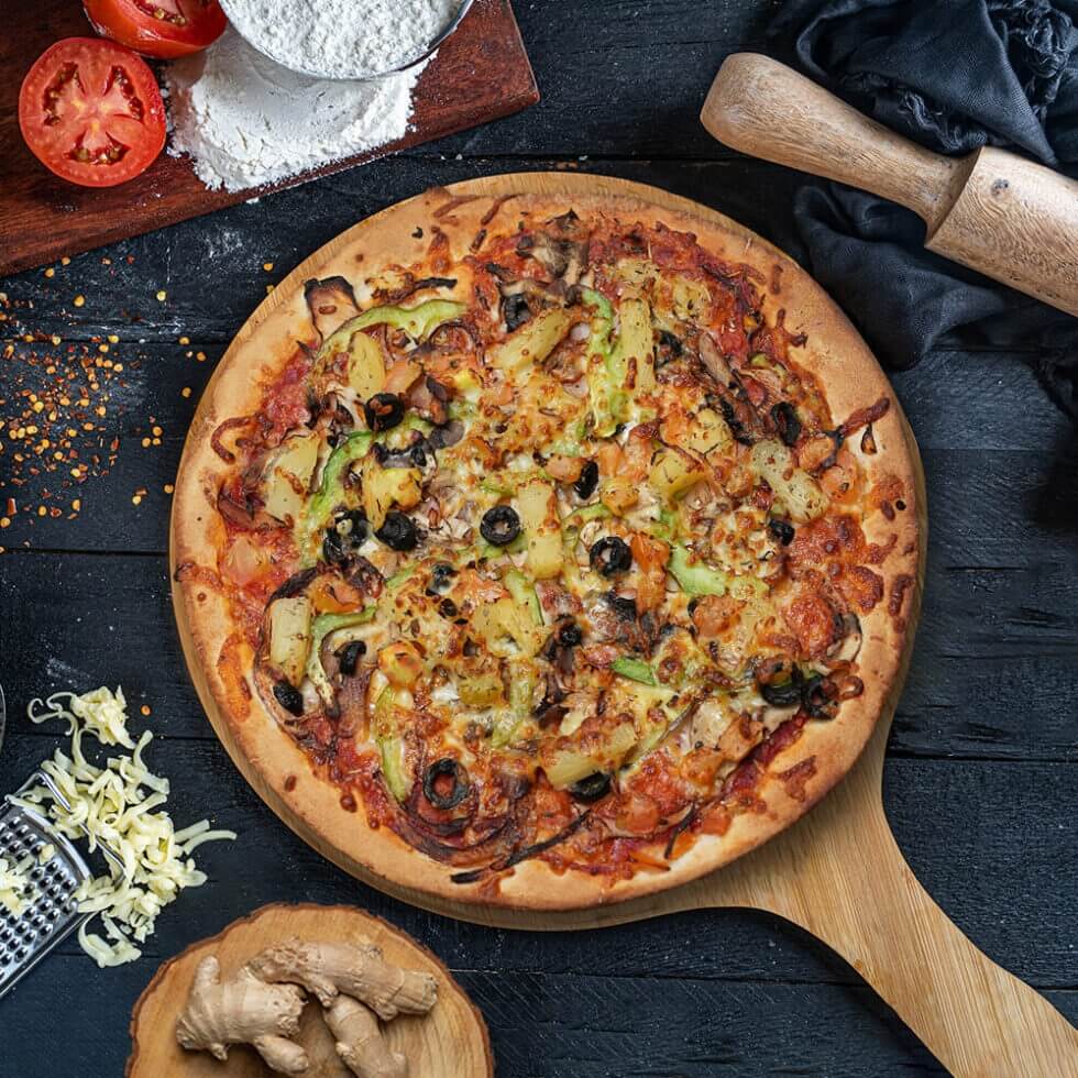 Tomato Sauce, Capsicum, Fresh Tomato, Mushrooms, Olives, Onion, Pineapple, Cheese and Mixed Herbs.
