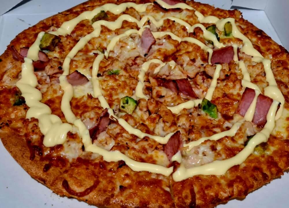 Tomato Sauce, Bacon, Chicken, Avocado, Onion, Cheese and Hollandaise Top Sauce.