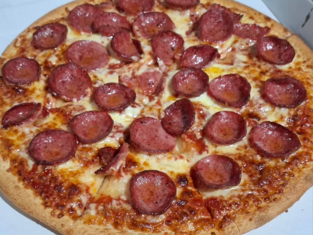 Tomato Sauce, Pepperoni, Jalapenos, Onion, Cheese, Black Pepper and Chilli Flakes.