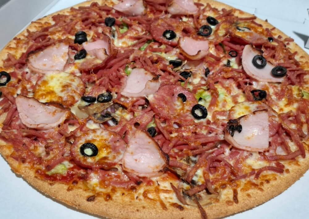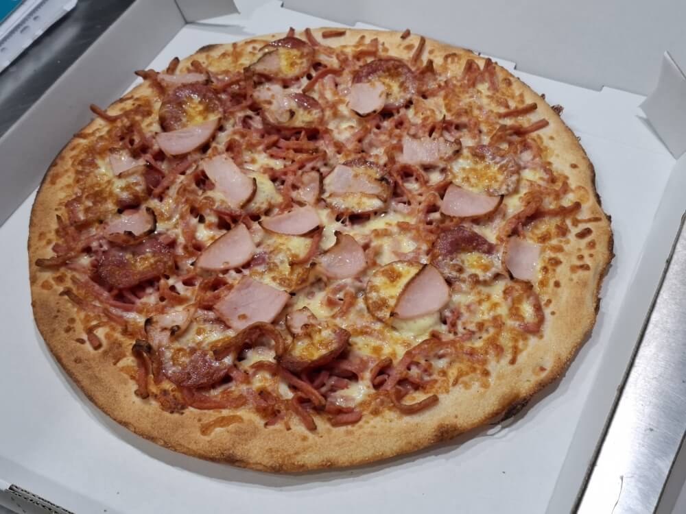 Capsicum, onion, mushroom, pineapple, olives, ham, bacon, pepperoni cheese on tomato sauce.