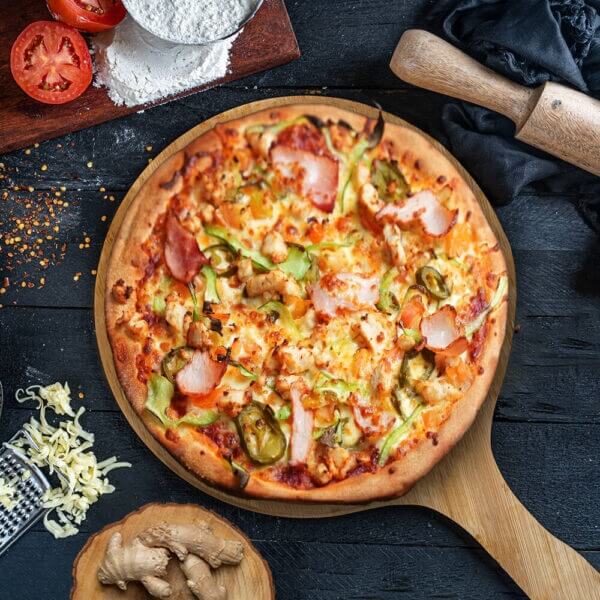 BBQ Sauce, Bacon, Chicken, Capsicum, Fresh Tomato, Jalapenos, Cheese, Garlic and Mixed Herbs.