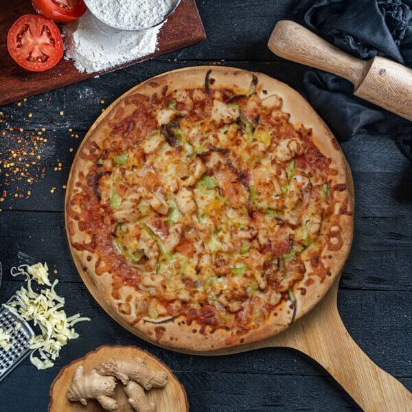 Tomato Sauce, Tandoori Chicken, Capsicum, Fresh Tomato, Onion and Cheese swirl with mint sauce